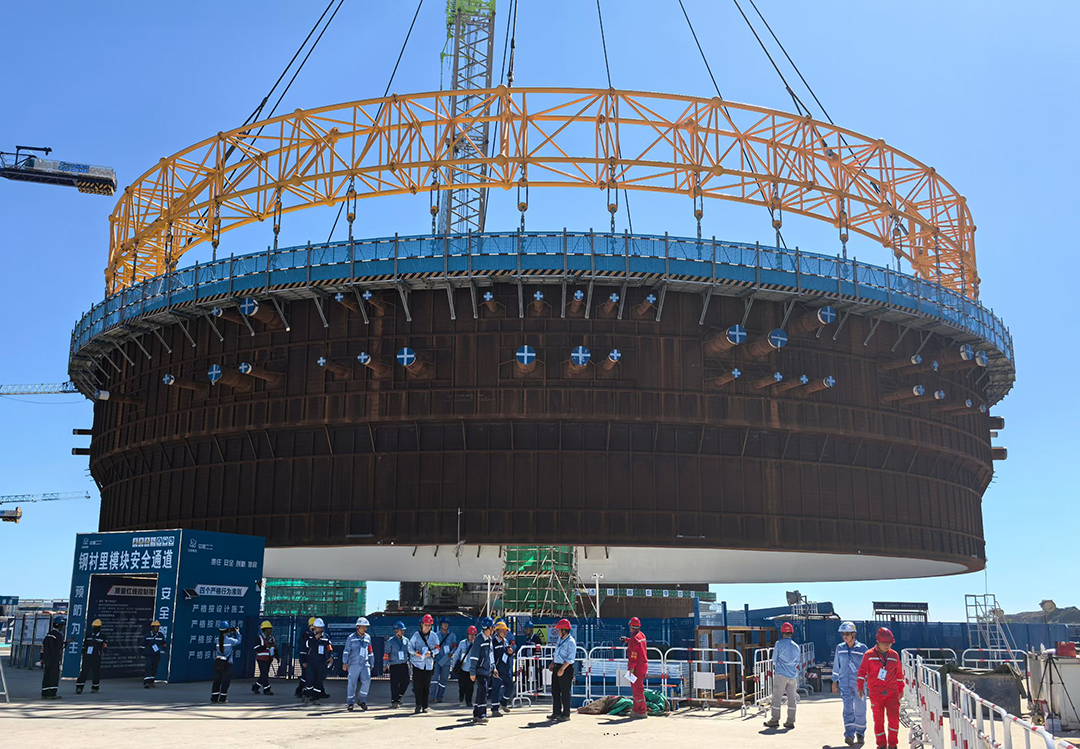 9月28日,金七門核電1號(hào)機(jī)組鋼結(jié)構(gòu)安全殼鋼襯里模塊一平穩(wěn)落位,首個(gè)大型模塊吊裝任務(wù)圓滿完成。此次吊裝采用了以巨力索具環(huán)形吊具為代表的先進(jìn)吊裝技術(shù),實(shí)現(xiàn)了安全精準(zhǔn)的吊裝作業(yè)。